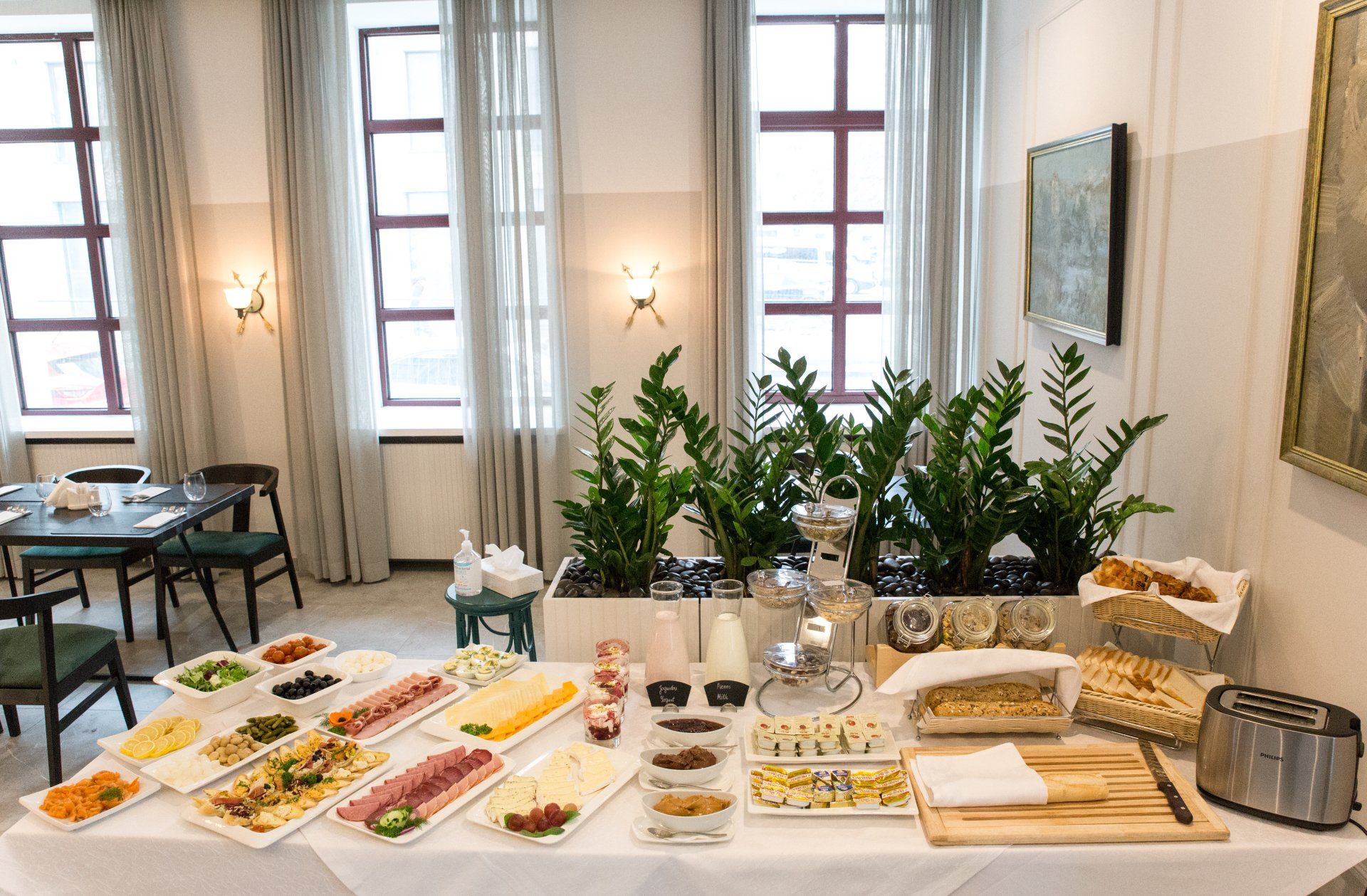 Kiekvieną rytą viešbučio svečiams patiekiame šviežiai gaminamus plataus asortimento švediško stalo pusryčius.